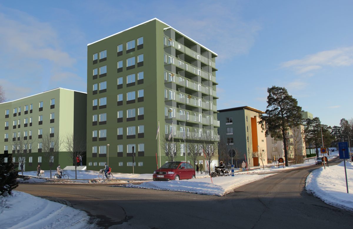 I norr byggs ett punkthus och två lamellhus på ett ge­mensamt garage och i söder byggs ett punkthus samt tre lamellhus. I lamellhusen finns studentlägenheter om 1–3 rok på 25–43 kvm. I punkthusen finns något större lägenheter, till största delen 2–3 rok om 39–56 kvm.